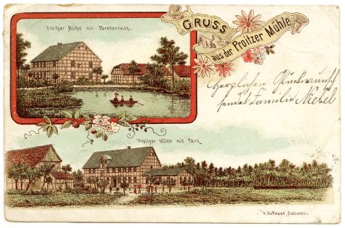 Oben: Proitzer Mühle mit Forellenteich