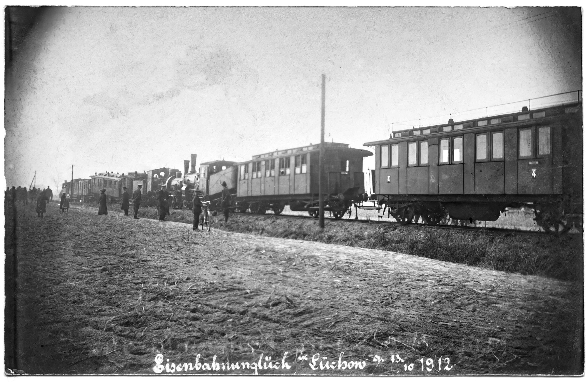 "— Ein Eisenbahn-Unglück mit erheblichem Materialschaden im Gefolge ereignete sich gestern morgen auf der Strecke Lüchow—Dannenberg kurz hinter unserem Bahnhofe. Der 7.30 Uhr von Salzwedel hier angekommene Zug mußte, wie das immer so üblich, rangieren und zu diesem Zweck, da er eine große Wagenzahl hinter sich hatte, eine größere Strecke über das eigentliche Bahnhofsgebiet auf das Dannenberger Gleis hinausfahren. In diesem Augenblick kam der erste Frühzug von Dannenberg, der Verspätung hatte und darum in einem etwas schnelleren Tempo gefahren sein mag, und fuhr, trotzdem der Lokomotivführer die Gefahr im letzten Angenblick erkannte und Gegendampf gab, mit großer Wucht auf den rangierenden Salzwedeler Zug auf. Der Zusammenstoß erfolgte unter fürchterlichem Krachen und hatte zur Folge, daß zwei Wagen zur Hälfte ineinandergeschoben und sechs andere erheblich beschädigt wurden. Von dem Dannenberger Zug schwebte der Vorderteil der Maschine in der Luft und zeigte schweren Schaden. Die Puffer und Laternen der Lokomotive lagen gebrochen neben dem Bahndamm und das Grundgestell war nach allen Richtungen verbogen. Zwei Personenwagen dieses Zuges, die ohne Bremse liefen, wurden bis zur Plattform ineinandergedrückt, bei vielen anderen erblickte man Beschädigungen an den Puffern und an den Fenstern. Am schlimmsten sah jedoch der Salzwedeler Zug aus. Er hatte den ganzen Anprall zu leiden gehabt und war an vielen Stellen aus dem Gleis geworfen worden. Die Lokomotive des erstgenannten Zuges hatte sich gehoben und war auf die Maschine des aus Salzwedel gekommenen Zuges ein kurzes Stück hinaufgeschoben worden. Dadurch hatte der Tender besonders stark gelitten; die Achsenlager waren geplatzt und das Oberteil in den Postwagen, der entgleist war, hineingedrückt. Die dann folgenden Personenwagen mit Abteilungen 2. und 3. Klasse waren ineinandergeschoben und fast vollständig zertrümmert.