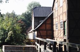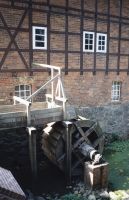 Das Bild zeigt die Wassermühle Tangsehl. Die Aufnahme müsste Anfang der 1990er Jahre entstanden sein, da das Wasserrad und das Stauwehr noch recht neu aussehen. Beides wurde 1990 erneuert.