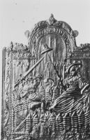 gusseiserne Ofenplatte, wohl 17. Jh. Vergleichsobjekte vorwiegend von 1667, teilweise neu gegossen 1880. Ursprung niederländisch, auch im Siegerland gegossen. Die Symbolik ist umfassend, z.B. die "neederlandsee Maagd" als Personifikation der Freiheit und der Löwe mit sieben Pfeilen für die sieben Provinzen der Utrechter Union.
