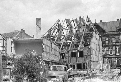 "Wenige Stunden, nachdem die letzten Bewohner Lüchows ältestes Haus verlassen hatten, bot "Fröhlings Marie" auf der Jeetzelinsel dieses Bild. Der Abbruch macht schnelle Fortschritte und es wird nur noch Stunden dauern, bis von dem alten Handwerker-Ständehaus höchstens noch einige Mauerreste künden und nicht anders wird es auch mit dem dahinter noch unversehrten Gebäude sein, dem Lücking'schen Hause, das als letztes auf der Insel die Spitzhacke erwartet."