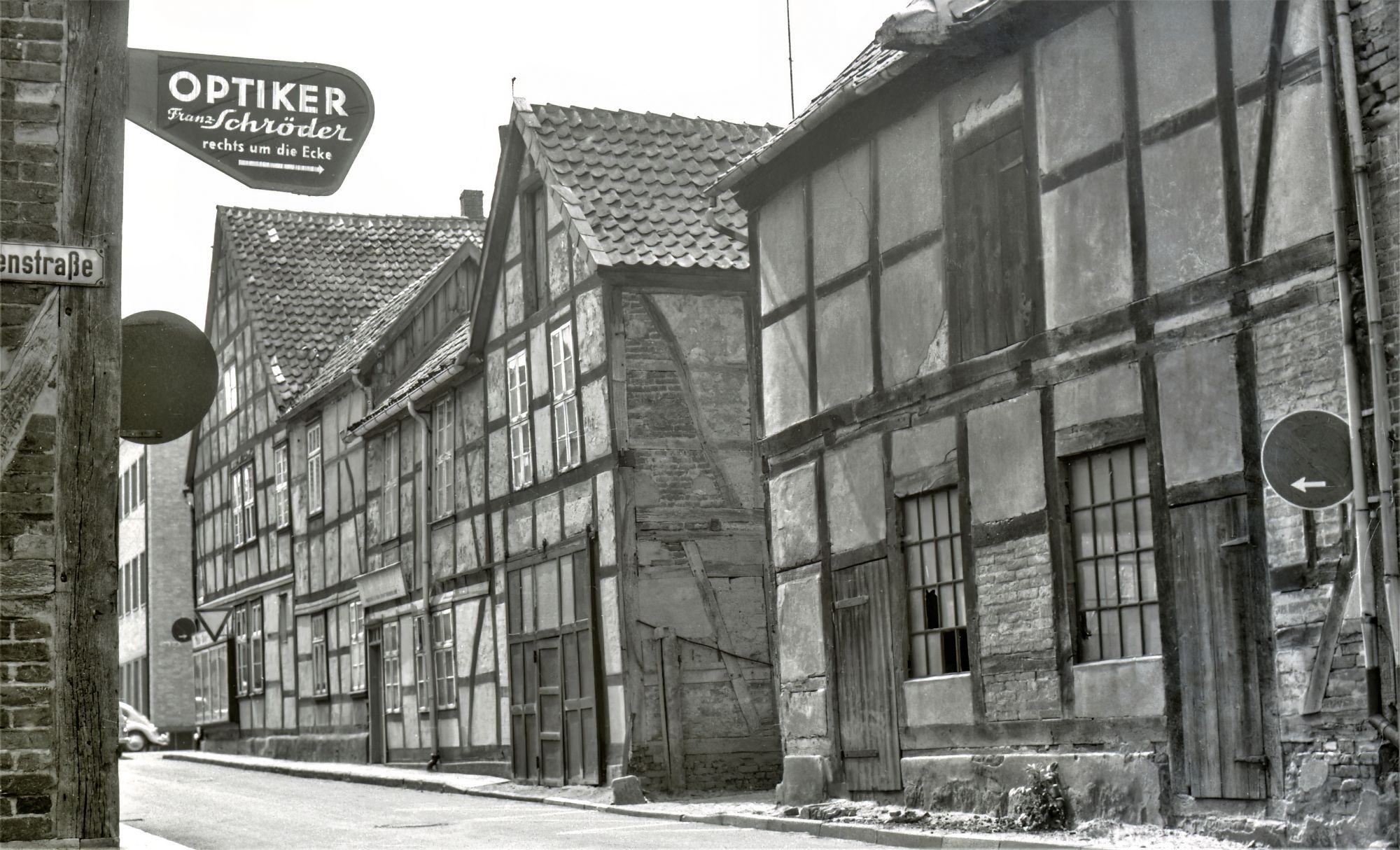 das rechte Gebäude war der Lagerraum von Neubauers,es wurde abgerissen u. war dann der Lagerraum von Maler Wenk.Dahinter ging es zu Bertrams Garten,in den Hintereingang der Gastwirtschaft u. Hotel Held u. weiter zu Opa Kaprolat. Im Haus auf der linken Ecke wohnte die Familie Dannefeld mit den Kindern Arnold, Trudel u.Margret. Der Optiker Schröder war da wo heute der Optiker Willam ist. Im Haus auf der rechten Ecke glaube ich war der Hutmacher Kraeft