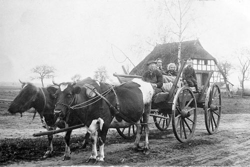 Das Kuhgespann war um 1910 unterwegs und zeigt den Landwirt Wilhelm Richard, seine Frau Marie, seine etwa fünfjährige Tochter Agnes (geboren 1905) und einen Pflegesohn.