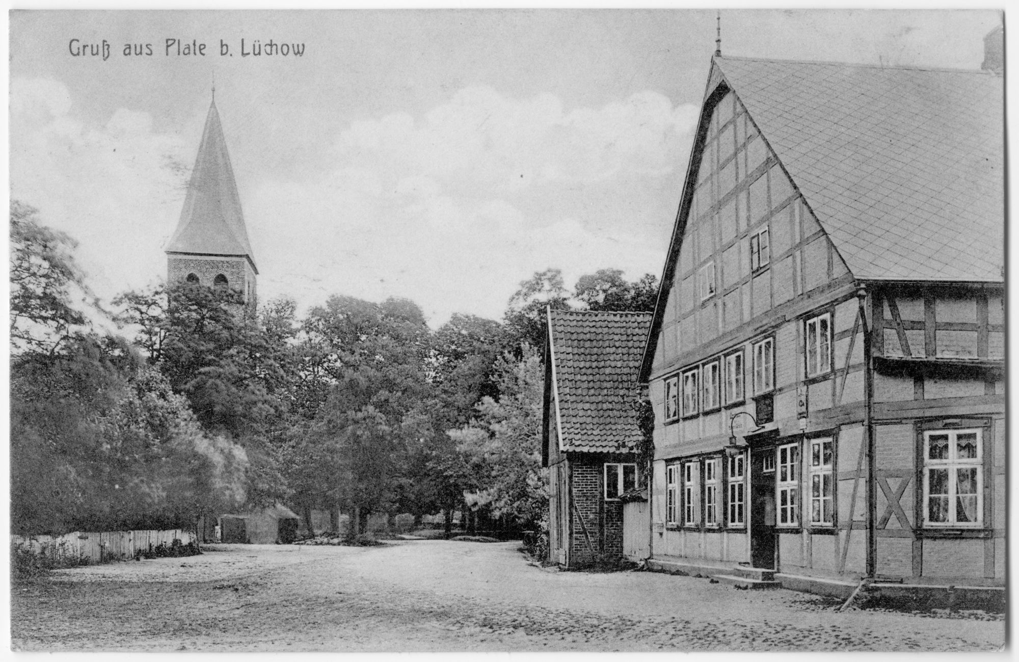 Gasthaus von Hermann Schulz, allgemein "Plater Hermann" genannt und Kirche. Am Gasthaus ist rechts oben neben dem Eingang ein Schild für eine Poststelle montiert.