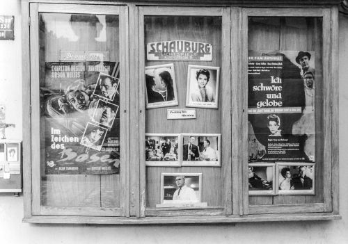 Die Filme im Schaukasten erlauben die exakte Angabe des Aufnahmejahres. Auf dem Programm stehen "Ich schwöre und gelobe" und als Vorankündigung: "Im Zeichen des Bösen", Regie Orson Welles. In den Hauptrollen: Charlton Heston, Janet Leigh und Orson Welles, sowie als Gaststars Marlene Dietrich und Zsa Zsa Gabor.