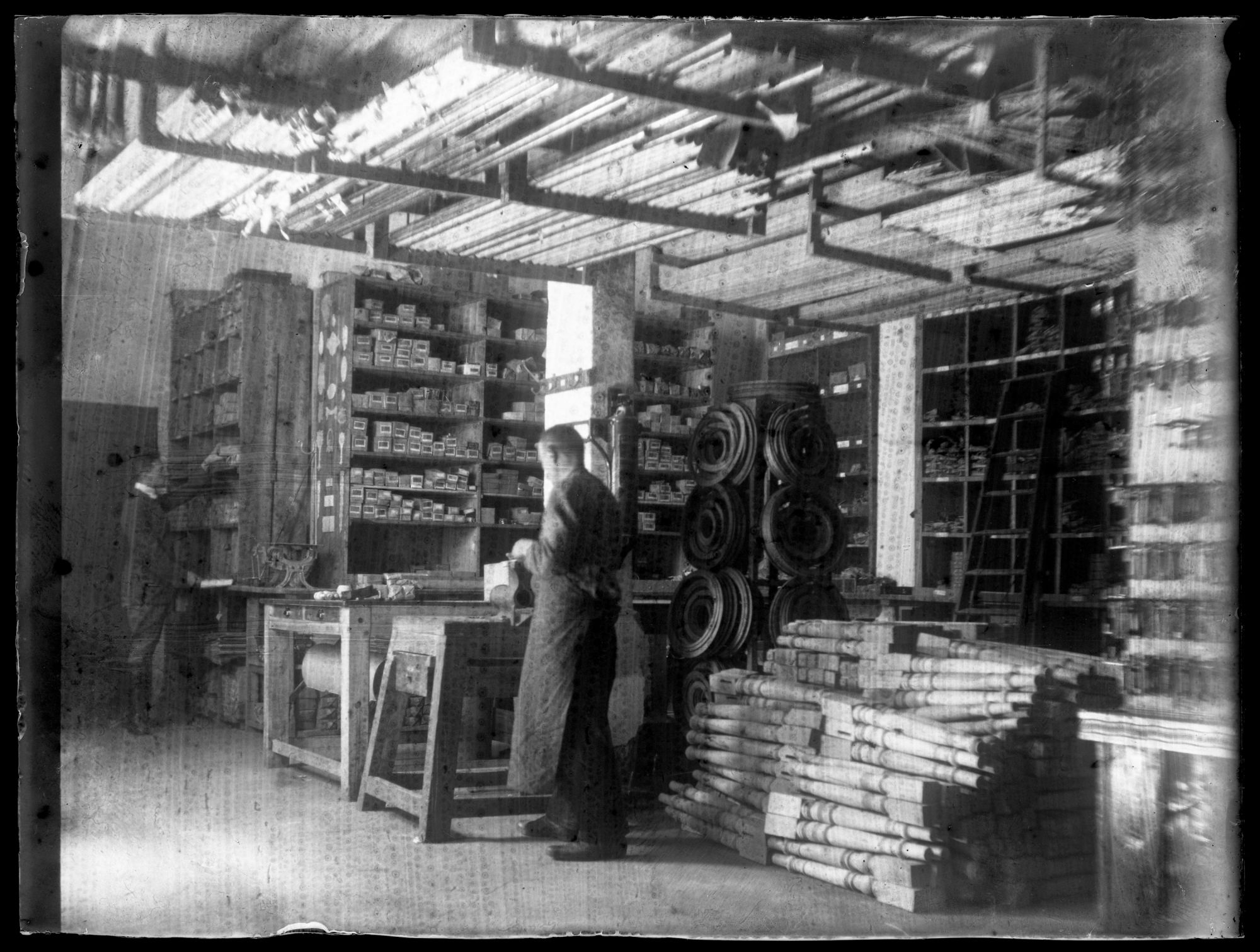 Geschäftsraum - links vornehm gekleidet der Inhaber. Vor dem Mitarbeiter Packtisch darunter Rolle Packpapier. Rechts Schlüssel. Zwischen den Personen Kleinteilregal daran links Auswahl Möbelbeschläge.Unter der Decke Metallrohre. Am Boden gestapelt im Viererpack Tischbeine.